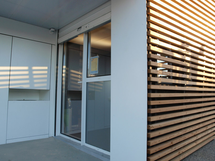 entrance. above the ticket machines, a wooden canopy extends to protect customers with integrated lighting