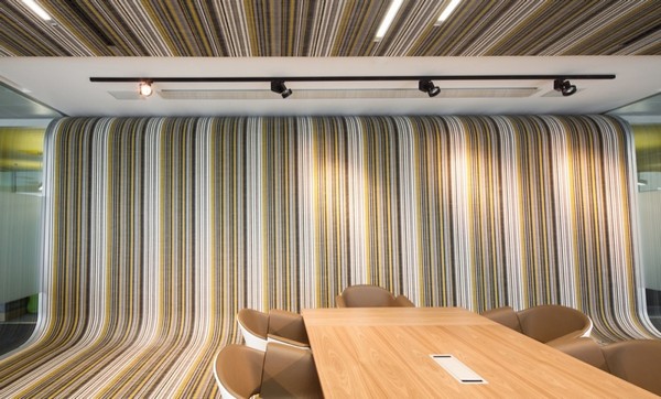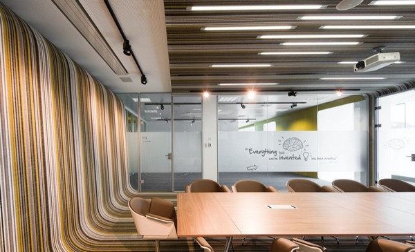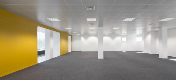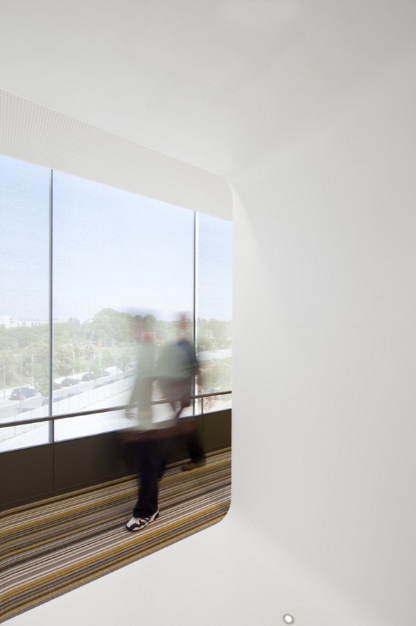 This main axis allows access to all different spaces. These spaces, with different functions and sizes, are generated and consolidated through a bold gesture: a waving plane that goes through the open floors, creating different spaces and ambiances. The spatial and visual dynamics are generated by a free plane that travels through the space and by colour, that reinforces the perception of different volumes. The waving surface acts, depending on the context, as ceiling, wall or floor of offices and meeting rooms, guaranteeing visual continuity, movement and flow. Another important asset to the project is the introduction of several small social and meeting spaces, named silent rooms, which allow for personal retreat, as well as informal meetings or resting. These spaces are intended to generate a highly creative environment promoting comfort and well being among the researchers". [Photography: Jo?o Morgado]