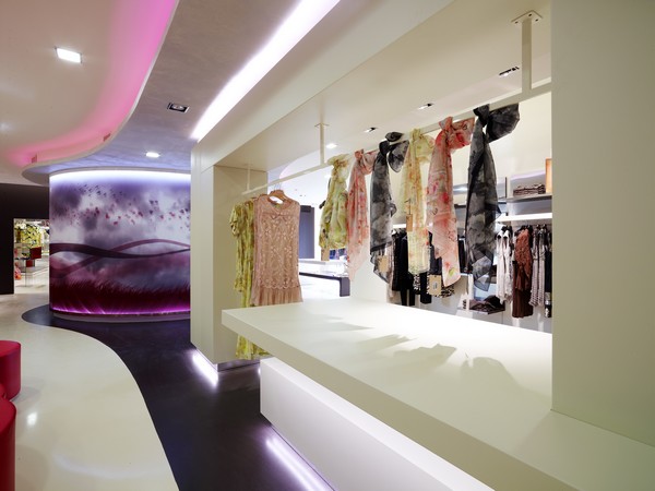 When it comes to creating an Italian fashion store based on a company's overall communication strategy, things can get tricky. However,Alberto Apostoli Studio came up with a design that is both appealing and brand oriented. Here is the official description of the Eliseo store from the architects: "The concept underlying this project is based on a combination of creativity and rationality and evolves through a refined use of form, light and colour. Rationality is implicit in the use of squared shapes executed in glass and metal; creativity is mainly to be seen in three elliptic elements rising from the floor to model the false ceilings, thus contributing to separate the retail space into three distinct areas: menswear, ladies' wear and young fashion. Important elements of emotional communication with the clientele are, for example, the back‐lit glass display cabinets, the RGB lighting of the false ceilings and the "honeycomb" display units in glass and metal. The LEDs, whose vertical and horizontal light is used by Apostoli as a proper surface covering, run all along the main aisles of the store and its furnishings, transforming the latter into sources of indirect light.