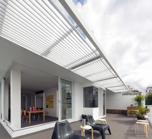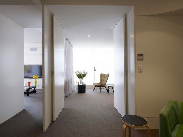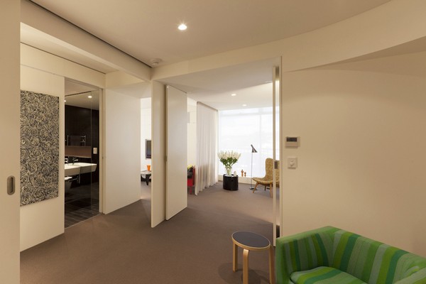 Large sliding and pivoting panels flexibly enable the second guest room to expand into and form part of the public area, gaining access to light and ventilation, thereby visually and physically enlarging the public area into the depth of the plan. A new study and sitting area are inserted near the entry, permitting access to alternative contemplative views of the harbor which can be visually delineated from the main living areas by a retractable curtain to flexibly contract or enlarge the living areas as required”. Enjoy the photo and please leave your personal opinions about this project below. [Photography: Brett Boardman]