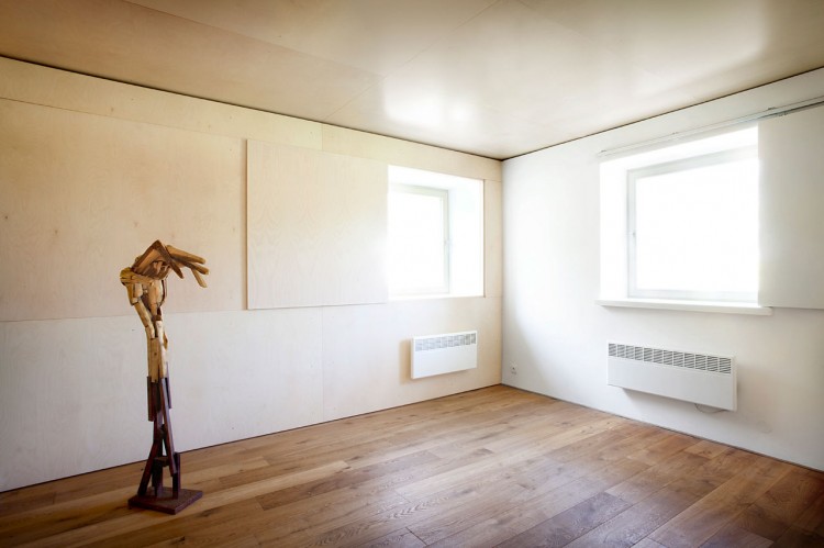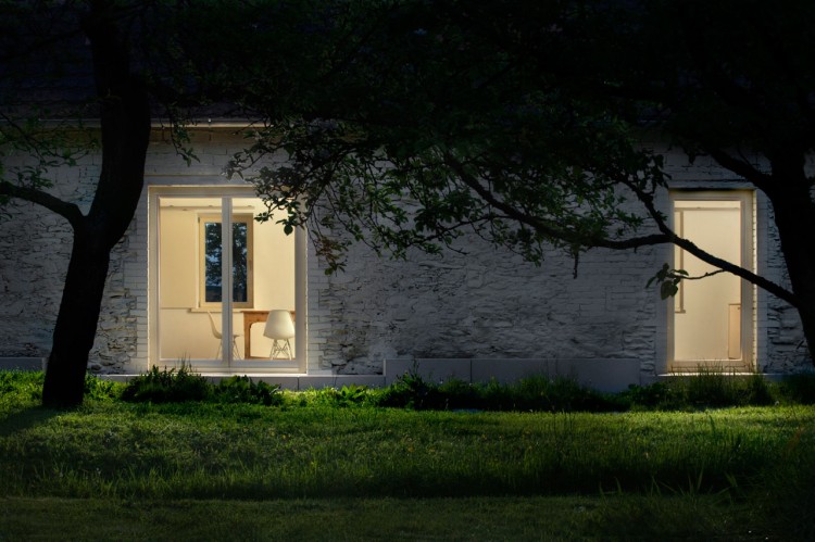 Orchard House by Nacházel Architekti: "This project involved the conversion of one of the oldest homesteads placed in the middle of an fruit orchard into a contemporary holiday home for a married couple with two children. The house retains its traditional rural character by keeping it single-storey and by preserving solid stone walls of an otherwise ruined house. On the facades there are preserved traces of the house development which are newly unified (both the retained masonry and the new openings) into a single paint. Openings in each of the facades are oriented toward the garden and provide plenty of light and openness during the daytime. New large openings in the west elevation shift the house into a heart of the fruit orchard. At night or when the house is not in use, it can be easily secured with shutters from inside of the house. To heighten the interaction between inside and outside space, a concrete slab from an entrance hall continues outside of the house and becomes a porch, a concrete bench that provides basic outdoor seating. The interior space is bounded by maintained stone walls which are covered with white stucco, whereas new partition walls and furniture are made of birch plywood. Several wooden puzzle pieces fit in an existing volume and create a new organisation of the inner space. The house is organized along a single corridor where all the rooms are linked up by this passage. According to privacy demands, the corridor becomes part of the rooms (living room, entrance hall, kitchen) or it remains separated from private rooms by sliding doors (bathroom, bedrooms). A walk through the house becomes a tour through the family life. This idea is supported by a different use of material in almost every section. The picture differs from one room to another, as we walk the corridor through."