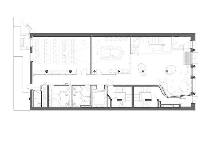 Private student and faculty offices were shifted to the north and south ends of the upper floors, which have better lighting and are quieter. Teaching labs are located along the adjacent walls and common spaces are located in the center of the floors to create a collaborative environment. The ground floor enjoys a large open space for public functions with views out through the picture windows on to the street. Sliding glass walls create flexible environments to accommodate different sized groups and prominent staircases encourage people to walk rather than use the elevator.