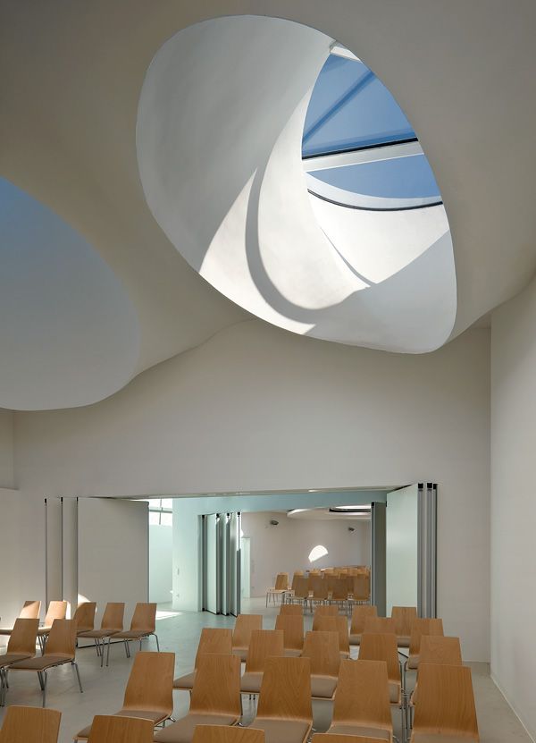 Das Spiel mit Licht und Transparenz ist bei diesem Projekt von wesentlicher Bedeutung. Das Licht kommt von oben: drei gro?e ?ffnungen im Dach, wie Schnecken geformt, leiten das Licht nach innen. Die Analogie der Zahl Drei zur Trinit?t der christlichen Theologie kann man dabei als ?bewussten Zufall" deuten. Der Kirchenraum selbst ist nicht nur ein mystischer Raum und Ort der Ruhe, als Kontrapunkt zu einer relativ schnelllebigen und medial dominierten Zeit, sondern zugleich ein offener Gemeinschaftsraum.