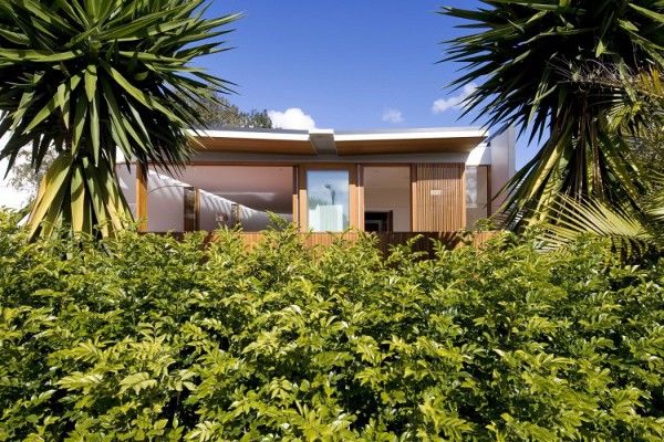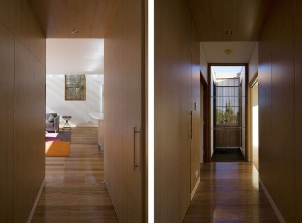 The building accommodates changing climatic conditions through natural ventilation in all directions, two integral fish ponds and vegetation that cool the summer breeze, and large awnings and timber screening to shade living areas while providing privacy. Public spaces are separated from private spaces by a central structural zone. Constructed of timber studwork and clad with Spruce veneer, this core accommodates the service and storage requirements of the home. A defining element in the interior is the sinuous skylight that runs the length of the building and washes light down the eastern external wall.