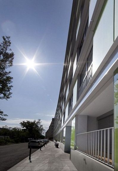 In front of the balconies, sliding panels made of laminated enameled tinted glass can be easily rolled and displaced by inhabitants, creating an intimacy screen and giving a random mode aspect to the facade. The other facades are covered with laminated tinted taped glass panels placed