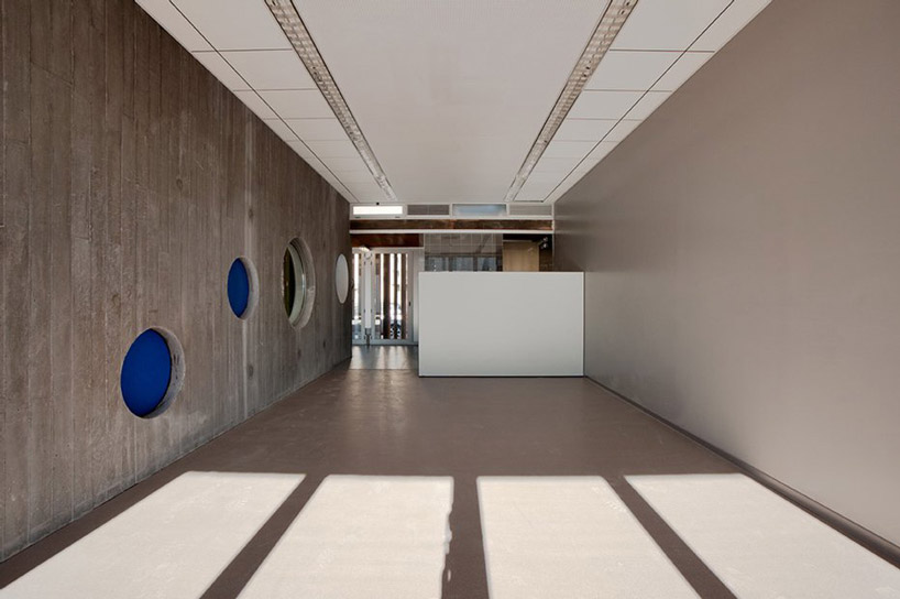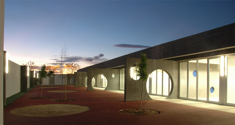 architecture and design firm r studio has designed 'pio baroja nursery' a local school in valencia, spain. this one story building is located in the third largest city in the country. having the site at street level meant it was influenced by the near-by high speed traffic and the surrounding skyscrapers. the creation of an inner courtyard brings intimacy and a sense of security to the space. the circular motif throughout the structure emphasizes the sense of play and movement around the school environment.