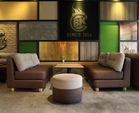 Custom designed lounge seats and ottomans are upholstered with outdoor fabrics that are water repellent. The lounge seating area is set against a collage wall of materials and textures, most of which are applied throughout the restaurant, from raw concrete to clay bricks, wood veneers as well as cork, blackboard, copper and brass. BK’s branding and slogans can be applied in a more engaging way with this material wall.