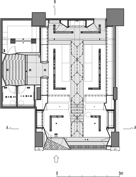 The upper level sales area showcases the men’s and women’s ready-to-wear collections in the black crystalline niches on both sides.